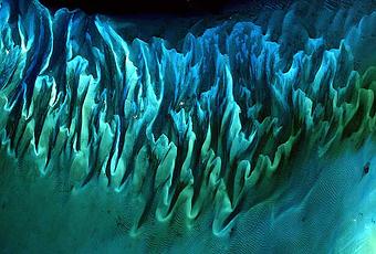 El mundo submarino es extraño e inquietante. Esta fotografía del Observatorio Terrestre de la NASA captura la belleza etérea de las dunas de arena bajo el agua en las Bahamas. Las mareas y las corrientes oceánicas moldean la arena bajo el agua tanto como el viento sobre la tierra, pero el resultado es lo suficientemente diferente como para ser de otro mundo.