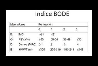 Ahora, sucintamente, queremos añadir un indicador de calidad de vida que puede ser útil en la valoración de fisioterapia (1). Se trata del índice BODE (2), acrónimo de índice de masa corporal (Body mass index), Obstrucción del flujo de aire, Disnea y capacidad de Ejercicio. Supone una ampliación de la visión de la enfermedad, pues tiene en cuenta aspectos sintomáticos, nutricionales y repercusión en la capacidad de ejercicio. Aporta, además, un valor pronóstico, puesto que estima la supervivencia a cuatro años.