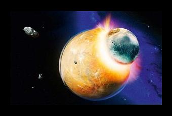 Ilustración artística de la formación de la Luna a partir de la colisión de Theia. Crédito: Detlev Van Ravenswaay/Science Photo Library.