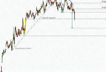 Observando el gráfico, llama poderosamente la atención el doble techo configurado entorno a los 109.80 euros y la posterior secuencia de máximos relativos decrecientes que vendría a confirmar el posible cambio de tendencia en la acción.