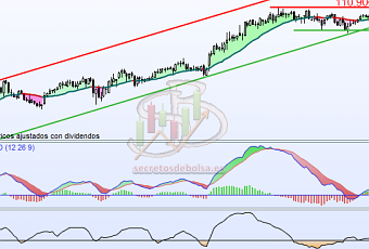 ón a la que nos enfrentamos es la siguiente: el precio realizando lo que de momento es un recorte, la mm de 30 sesiones alcista, una bajada de volumen durante el tramo de caída, un RSc Mansfield que muestra debilidad y una divergencia bajista en el Macd. Por tanto, es muy probable que la divergencia cumpla su cometido por lo que el preci puede llegar a cotizar en la parte baja del canal alcista en el que se encuentra. Mientras no pierda el soporte de los 97,4€ no debería haber problemas ante un cambio en su tendencia general.
