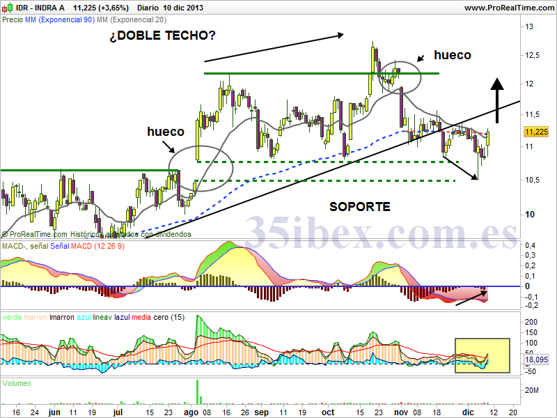 La figura de vuelta la tenemos formada entre los mínimos del 20 de noviembre y 5 de diciembre. Tenemos una falsa ruptura bajista, con divergencia del indicador MACD. Divergencia de libro.Hoy la mano fuerte parece que ha vuelto a apostar por Indra, me imagino que influenciada por las recomendaciones positivas que ha recibido hoy el valor por parte de la firma de análisis Jefferies, aunque no acabo de entender a esta gente. Resulta que elevan el precio objetivo, se deshacen en elogios a la compañía, para luego decir que el precio objetivo es 9,30 euros. ¿Vds. lo entienden?