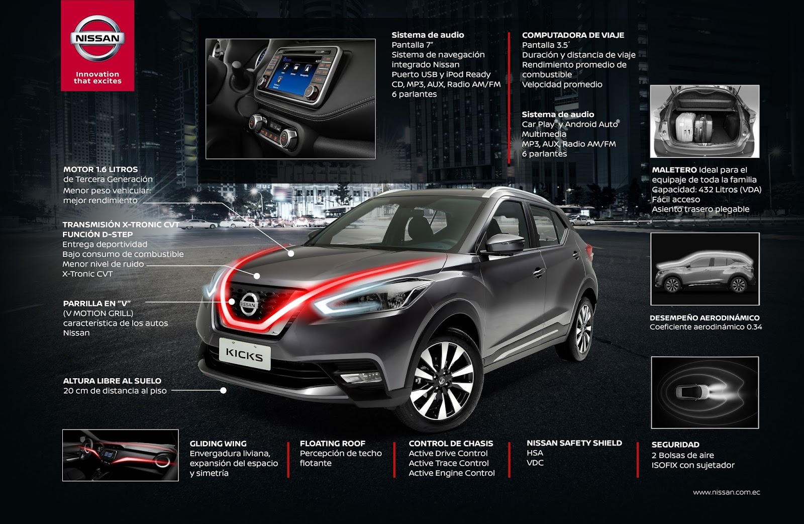 Nissan KicksInspirado en el público y estilo de vida latinoamericano, Nissan Kicks es un crossover versátil ideal para afrontar todos los desafíos de la "selva urbana". Es también uno de los primeros modelos de Nissan en aplicar el concepto de "Movilidad Inteligente" que reúne una gran cantidad de recursos de ingeniería y tecnología. Nissan Kicks traduce este concepto en un conjunto de atributos clave como un motor moderno, transmisión X-TRONIC CVT de última generación, el menor peso de la categoría y aerodinámica eficiente. Asimismo, Nissan Kicks viene equipado con tecnología avanzada en cuestión de seguridad como las tecnologías Dynamic Chassis Control, Active Trace Control, Active Ride Stabilizer Control, Dynamic Brake Control y Active Engine Brake en los grados más altos.Nissan Kicks representa la primera vez que Nissan lanza un vehículo primero en América Latina; este llegará paulatinamente a más de 80 países. Su producción por el momento está centrada en México mientras el Complejo Industrial de Resende se prepara para iniciar su producción en 2017 desde donde se exportará a toda la región.Con numerosos reconocimientos, Nissan Kicks es ya un éxito en ventas en Brasil y promete serlo en el resto de la región. Entre los galardones que ha recibido se encuentran: “SUV del Año 2017” recién otorgado por la Federación Interamericana de Periodistas Automotrices /FIPA), “Best Crossover of Latin America”, concedido por Americar; "Best Compact SUV" por L’Auto Preferita (Brasil), "Best SUV Importado" concedido por Top Car TV 2016 (Brasil), “The Best” y “Best SUV” del año, estos últimos por parte de Car And Driver en Brasil.