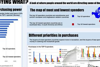 Infografía preparada para el curso de Alberto Cairo sobre Infografías y visualización de datos, que analiza las prioridades de gasto entre los países cuyos ciudadanos más gastan y los países cuyos ciudadanos gastan menos (al menos los países analizados en la encuesta “Euromonitor international“.