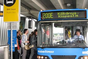 Una vez llegado al aeropuerto, hay que recorrer los escasos kilómetros que lo separan de Budapest. Hay 3 formas de hacerlo: la más económica es mediante el autobús 200E que enlaza el aeropuerto con la última parada de la línea 3 del metro de Budapest en su extremo sur, llamada Kőbánya-Kispest. La parada del autobús está a la salida del aeropuerto. Son autobuses azules, articulados, que pasan con mucha frecuencia (cada 5 minutos aproximadamente). Los tickets se pueden comprar dentro del propio aeropuerto, en un kiosko, o en las máquinas situadas junto a la parada del autobús, que disponen de menú en inglés, bien de forma individual o en bloques de 10 tickets. Es necesario validarlos dentro del autobús o tranvía (o al entrar a la estación de metro) en unas pequeñas máquinas que hay, unas cajitas naranjas o amarillas fácil de ver, que imprimen fecha, hora y una combinación de números en el ticket. No validarlo dentro del autobús o tranvía equivale a viajar sin billete (en los autobuses más antiguos son unas perforadoras mecánicas en lugar de máquinas electrónicas, por eso los billetes siguen llevando una combinación de números). En el metro hay que validar los tickets a la entrada en unas máquinas exactamente iguales, generalmente están junto a los revisores, pero a veces no hay revisores a la entrada (especialmente en paradas con pocos viajeros), lo cual puede ser una tentación para no validarlos, y de hecho nadie os controlará a la entrada si no hay inspectores, pero, ojo, que os pueden pedir los tickets luego a la salida, sobre todo en las paradas céntricas, por lo que hay que conservarlos hasta que salgamos a la calle del metro. Los mismos tickets sirven para todo tipo de transporte: metro, tranvía o autobús, aunque solo se puede hacer transbordo entre líneas de metro. Si se cambia de autobús o tranvía hay que validar un nuevo ticket. La última parada del 200E es el intercambiador de Köki (estación de Kőbánya-Kispest), donde hay que bajarse (también sirve la penúltima, solo hay que caminar hacia atrás a una pasarela a la que se accede mediante unas escaleras, en cualquier caso para los que van por primera vez recomiendo esperar a la última parada) desde aquí solo hay que seguir los carteles hacia el Metro 3, que recorre Budapest de sur a norte, generalmente los alojamientos y hoteles a los que van los turistas estarán en el centro de la ciudad, que cada cual considere la parada más a mano para bajarse. Para este viaje hacen falta 2 tickets (uno para el autobús y otro para el metro), con un coste total de 700 forint (unos 2,3 €).