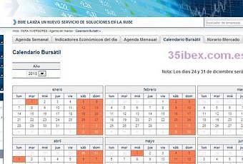 En la página de la Bolsa de Madrid, además del calendario anual, con los días en los que el mercado bursátil estará abierto, también encontrarás el calendario semanal y mensual. Estos calendarios te sirven para saber, cuando una empresa reparte dividendo, tanto del IBEX 35 como del Mercado Continúo o cuando presenta resultados.