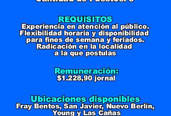✅ Requisitos:Experiencia en atención al público.Flexibilidad horaria y disponibilidad para fines de semana y feriados.Radicación en la localidad a la que postulas.