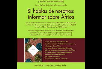 El próximo martes, 13 de diciembre, Casa África presenta en la Facultad de CC. de la Información, en la Complutense, el cuadernillo “Si hablas de nosotros”, una iniciativa con la que pretende dar voz a los propios africanos a la hora de hablar de sus problemas y el desarrollo del continente. El libro, que se puede leer online aquí ha dado la palabra a diversos periodistas africanos para que expliquen y critiquen también libremente la información que desde el Norte ofrecemos sobre África.