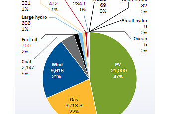 Energía solar fotovoltaica es la líder en las nuevas instalaciones de energía en el 2011, representando 21 GW (46,7%) de nueva capacidad de energía, como se puede ver arriba, según la información de EWEA.
