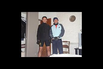 Comemos, hacemos pis, volvemos a comer, café, lo que haga falta para entrar en calor. Cada uno se abriga con lo que puede, incluso con batines como se ve en la foto, jejeje, ropa desechable porque 1h30' antes hay que dejar la bolsa en el camión de UPS que luego te llevarán a la meta. Aprovecho para tumbarme al sol un ratillo y enviar los últimos sms...7.50 a.m.
