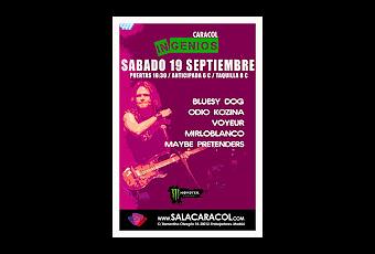 Caracol sigue con su ciclo Ingenios; un ciclo lleno de sorpresas musicales. La sala Caracol nos sigue presentando su ciclo Ingenios; un ciclo lleno de sorpresas y de grandes grupos como Odio Kozina o Voyeour; dos grupos que siempre tienen un gran directo al igual que Mirloblanco; Bluesy Dog