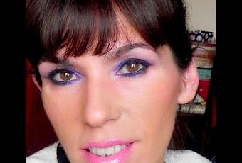 A continuación apliqué la sombra a toquecitos subiendo un poco por arriba del pliegue. Como ahí ya no había jumbo, al difuminar se ha degradado a un tono más claro, dando impresión de un trabajo más elaborado que en realidad ni siquiera es necesario cuando lo hacemos así: es un look muy rapidito. A ras de pestañas inferiores también perfilé de negro antes de aplicar la sombra, por eso el tono de morado que se ve es el mismo. En el lagrimal llevo de nuevo el pigmento de MAC y, como ven, delineado negro y máscara.