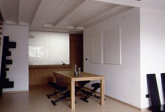 Se trata de aprovechar un espacio bajo cubierta en una antigua casa entre medianeras. El espacio de partida es oscuro y opresivo, bajo una cubierta que la normativa urbanística permite elevar. Constructivamente se adopta la solución presente en todo el edificio a base de una estructura ligera apoyada en los muros medianeros, con particiones igualmente ligeras. Se utiliza la estructura de acero por su analogía con la de madera y su mejor disponibilidad.