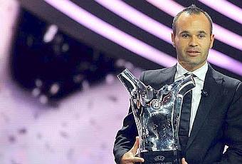 Iniesta sostiene el trofeo que le acredita como mejor jugador de la UEFA de la temporada pasada - EFE.