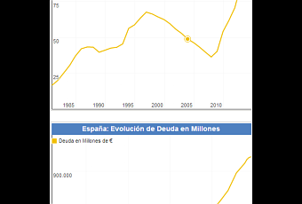 Los gráficos que aparecen a continuación reflejan la evolución de la deuda pública española tanto en porcentaje del PIB como en valor absoluto. (Haced clic sobre el cuadro)