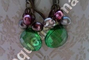 Están hechos con cristal verde y perlas cultivadas en tonos rosas y grises, unidos por una cadena de oro viejo, decorada con cuentas facetadas verdes. La verdad es que me gusta mucho el resultado del conjunto. Espero que a vosotr@s, también os guste.