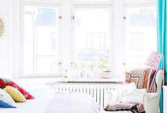 Decorar un dormitorio en blanco mezclando tantos colores diversos es como pintar un lienzo en el que podemos dejar volar nuestra imaginación. ¿Podríamos mezclar un rosa pastel con un turquesa intenso, con estampados rojos, verdes y amarillos?... Pues aunque suene arriesgado, la mezcla funciona y además queda así de bonita.