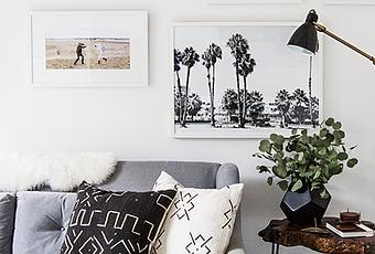 Seguro que más de una vez os habéis planteado poner una bonita composicoón de fotos en casa porque es un recurso muy socorrido, y muy asequible, para darle estilo a una estancia. Y además es una de las maneras más personales de decorar una pared de nuestro hogar dándoleun toque nuestro, único e irrepetible. ¡Decoración a la carta! Y lo mejor de esta decoración es que sólo tienes que cambiar alguna foto o lámina para darle una nueva imagen. Una buena idea es hacer la composición con marcos de diferntes colores y tamaños. Aquí los vemos todos en blanco pero con diversos formatos. Hay diferentes formas para componer nuestra pared de fotos: hay quien prefiere hacerla primero en el suelo, hacer una foto y pasarla luego a la pared para ver cómo queda, otros sin embargo usan papeles de periódicos con las medidas de los marcos para hacerse la idea de cómo encajarlos o, como vemos aquí, utilizando washi tape para preparar la composición. Sea como sea, os animamos a hacerlas porque quedan genial.