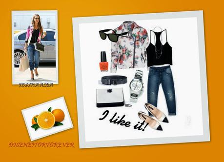 Buenos días!!!!A casi todas se nos ponen los ojos como platos cuando vemos las revistas y vemos a todas esas chicas famosas con sus maravillosos modelitos, las "it girls". A falta de sus holgados bolsillos nosotras nos conformamos con imitarlas o más bien inspirarnos en ellas. Por suerte las marcas low cost tienen todo un abanico de posbilidades para que esto suceda. En fin, yo hoy os traigo un look inspirado en Jessica Alba, que espero os guste.Aprovecho este outfit para mostraros los vaqueros "boyfriend". Estos son de Zara http://www.zara.com/es/. No olvides que estos pantalones acortan la figura, por lo que, si no eres muy alta, siempre con tacones. El reloj, los zapatos y el bolso, son también de Zara. El top es de Berskahttps://www.bershka.com/. La chaqueta-cazadora es de Blancohttp://www.blanco.com/, el cinturón de Dieselhttp://www.diesel.com, las gafas de Ray-Ban y el colgante de Mango http://www.mango.es.