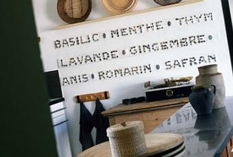 Cemento, madera, y el toque rústico de las letras hechas con piedras en la pared. Preciosos los farolillos de papel en el techo.
