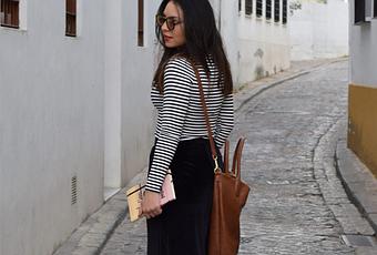 Con el bolso en tonos tierra, nos salimos de la tónica del negro y aportamos luz al outfit.