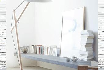Acogedor y bonito rincón de lectura donde  los libros están colocados sobre un banco volado de hormigón. La lámpara me encanta!!