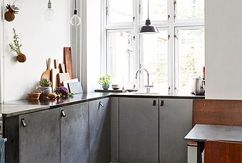 La búsqueda no ha sido fácil pero navegando encontré esa cocina en gris, negro y madera que sin duda reunía todos los requisitos. El mobiliario simula el cemento uno de los materiales tendencia y junto con la madera natural da un toque muy acogedor, quizás es algo oscura pero si tienes luz natural y buscas algo diferente dentro de un estilo ecléctico en el que domine lo escandinavo esta cocina puede ser una solución perfecta.