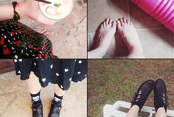 Feet. Lots of them. Sosteniendo un exprimido recien hecho, post-workout, o a modo de outfit post, mi angulo favorito es este en el que pueden ver lo que yo veo cuando miro abajo. Estoy como Scarlet en Perdidos en Tokyo cuando decia “intente ser fotografa pero solo le tomaba fotos a mis pies”.