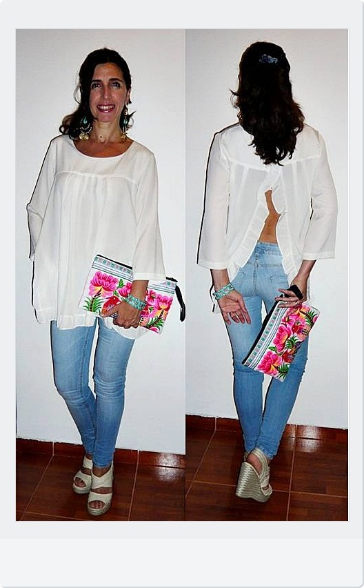 Blusa en crèpe de seda -Caro Müller-, Jeans -Las Oreiro-, Sandalias -Peruggia EX-, Sobre -Mel Barrow-, Pulsera -Dolores Iguacel-, Pendientes -Bendito Glam-.