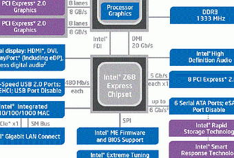 Además de esta característica, el Intel Z68 llega para ser usado con los procesadores Sandy Bridge, e incluye soporte para memorias DDR3 de hasta 1.333 MHz. en doble canal, un slot PCIE a 16X (el resto 8x) y SATA 6 Gbps.