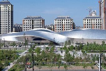 El exterior del edificio está cubierto por placas de acero pulido que refleja el entorno y los cambios de luz. Las paredes sólidas garantizan una mínima pérdida de calor, mientras que a última hora el movimiento de giro de los tragaluces emergentes divida la superficie para permitir el ingreso de la luz que cuelga bajo el sol del norte de China; esto proporciona suficiente iluminación natural difusa a las tres salas en el interior.