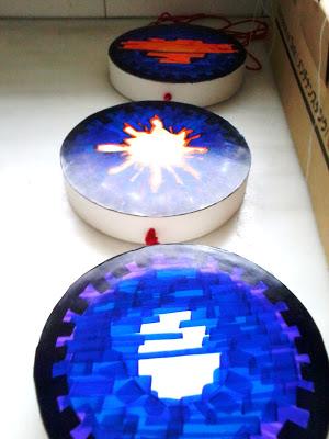 Debo reconocer que lo he examinado muy en profundidad, pues los círculos parecen un tubo cortado y los dibujos hechos a rotulador permanente. Todo unido por un cordón de algodón rojo. Muy colorido y original.