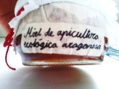 Llegaba el turno a lo dulce. Un tarro de miel de... Aragón! Ella maña y yo de un pueblo de Huesca no podía faltar algo que endulzara ese vínculo común. Presentada en un tarrito de cristal, tapado con una tela blanca y anudada con hilo rojo.