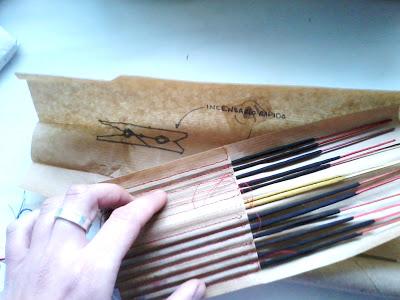 Había un paquete que se delataba por el aroma que desprendía. ¿Sabría mi compañera de intercambio mi afición por los inciensos? Un pequeño muestrario de inciensos con papel craft, donde había cosido los espacios para poner varitas de distintos olores (lástima que se hayan borrado los nombres, pero supongo que me los había indicado). Además me ha encantado el detalle de la pinza dibujada como inciensario improvisado!.