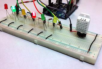 En este proyecto, usaremos un sensor ambiental DHT22, para captar la temperatura y la humedad del aire. Además, se usarán LEDs para indicar el nivel de cada uno de estos.