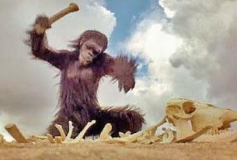 En la lucha de los dos machos dominantes, uno de ellos recoge del suelo un hueso de un animal, y con el golpea al contrincante, ganando la batalla. Al acabar se da cuenta de que acaba de inventar un arma y contento la lanza hacia arriba, ese hueso empieza a dar vueltas en el aire y se convierte en una nave espacial.