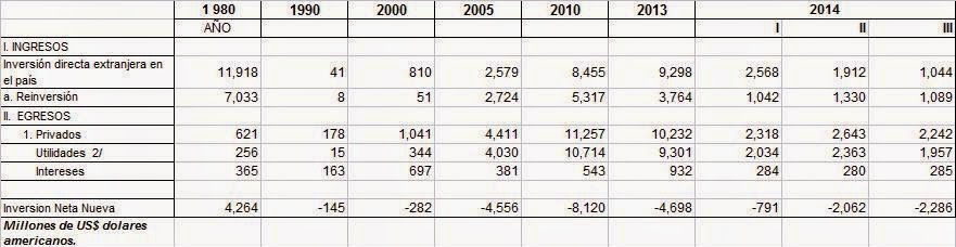 La relación denominada Inversión neta nueva es el resultado de la IED menos la reinversión menos los capitales retornados a la matriz (incluye la exportación de las utilidades y el pago de los intereses a la matriz corporativa).Increiblemente en los años del segundo gobierno del Arq, Fernando Belaúnde, la Inversión neta nueva tiene una relación positiva para el país, lo que significa que los capitales foráneos encuentran en el Perú mejores condiciones para retornar, este singular hecho cáe de manera catastrófica en el primer gobierno de Alan García y que asume en esas condiciones Alberto Fujimori. Lamentablemente muestra lo terrible de dejar en manos de "políticos" la dirección económica del país, así como el hábito no hace al monje, un título o grado profesional de alto nivel tampoco asegura el éxito de la gestión en la cartera de economía de cualquier país.La recuperación de los capitales provenientes del exterior, se hace mayor a finales del gobierno de Alejandro Toledo, sin embargo se profudiza en el segundo gobierno de Alan García, alcanzando altos niveles similares a los de 1980, pese a la grave crísis mundial ocasionada por la irresponsabilidad de los empresarios financieros y por la inexistencia de mecanismos regulatorios en el sector financiero mundial (hay que recordar que la desregulación toma fuerza en los años 80´s con Margaret Thatcher en el Reino Unido y con George HW. Busch en el gobierno de EE.UU). Sin embargo en el gobierno del actual presidente Ollanta Humala, se ha apreciado una fuerte reducción de la IED, donde se aprecia que los flujos de retorno de la IED son menores y esto es una muestra de desincentivo por parte del inversionista extranjero, esto significa que el capital extranjero esta buscando otros destinos, donde mantener sus altas tasas de rentabilidad, asegurando el capital físico invertido bajo reglas de juego estables.Surgen entonces voces que postulan "recetas" para mejorar las condiciones al ingreso de las IEDs, muchas posturas a favor, otras en contra, que reclaman mejor trato a los nacionales que operan bajo las IEDs, en el sentido del Dr. Horacio Flores de la Peña (..." Podría argúirse que los límites al crecimiento se hacen menos rígidos si se recurre al financiamiento externo, porque con él se logra reducir las presiones inflacionarias y aliviar la la situación en la balanza de pagos. Lo primero resulta cierto si la inflacion no es un fenómeno mundial y lo segundo solo es cierto a muy corto plazo, porque pronto se agota la capacidad de endeudamiento y el pago y el servicio de la deuda se convierten en un drenaje de divisas, igual que representan las inversiones directas, cuando las remisiones por intereses, dividendos y tecnologías, lleguen a ser superiores a los ingresos de nuevo capital...").Teoría y Práctica del Desarrollo. Horacio Flores de la Peña, F.C.E, México, 1976.Después de la fracasada política del "piloto automático" aplicada por el anterior ministro Luis Castilla (hasta el I semestre 2014), se esta proponiendo la eliminación de las "trabas" burocráticas que retrazan la toma de decisiones en los inversionistas, ahora que la tendencia de las inversiones es un retorno rápido de capitales; sin embargo esto va unido a las presiones sociales que el gobierno ha descuidado.No se puede tener a empresarios e inversionistas satisfechos, si existen presiones internas que pueden desbordar las reglas de juego propuestas para el inversionista; aqui un conjunto de fallas en la economía local que deben ser resueltas paralelamente a la re-entrada de capitales al país:- Salud y Saneamiento, la inversión del gobierno en este sector es muy pobre, la carencia de servicios médicos públicos de mediana calidad, obligan al uso de servicios privados mucho mas costosos que afectan a los ingresos disponibles de los hogares. Igualmente la reducida inversión en servicios de saneamiento básico, permite que las condiciones de vida aún sean consideradas marginales para muchos peruanos, esto atenta contra los bajos ingresos de los hogares, quienes reportan el uso de servicios de abastecimiento de agua y limpieza de silos por terceros, obviamente a su costo.- Transporte local, uno de los mayores problemas que atenta contra la competitividad en el país, es la reducidad inversión del Estado en aliviar los problemas de transporte local, dentro de un contexto de urbanismo y crecimiento demográfico de las ciudades, no existen políticas ciertas que buscan la solución integrada, con inversión; en este segmento, afectando seriamente a la movilización diária de los que generan recursos para el país, peor aún, soluciones parciales descordinadas entre municipios y gobiernos regionales son causal de mayores problemas que afectan al ciudadano común y a la rentablidad de los inversionistas.- Educación Técnica, Perú no cuenta con personal calificado para el desarrollo de las nuevas aplicaciones tecnológicas que hacen mas competitivas a las empresas especialmente a los inversionistas internacionales, la poca capacidad técnica se refleja en altos costos para la inversión del Estado, haciendo mas lentos y mas costosos estos; obviamente desincentivando a los inversionistas foráneos que desean participar en el crecimiento de la infraestructura del país. Muchos de los expedientes técnicos aún recomiendan equipamiento y accesorios y técnicas desfasadas y costosas (debido a que no aprovechan las economías de escala).- Corrupción e Institucionalidad, Este es un punto crítico, dado que permite de manera complaciente el desmantelamiento del aparato jurídico local, que subroga la institucionalidad por intereses particulares, en desmedro de la sociedad en general y de los inversionistas en particular, que esperan mejor nivel de transparencia en las reglas de juego y no "arreglos por debajo de la mesa" que representan un sobrecosto al inversionista extranjero.- El Costo de la Formalización, constituye una de las m