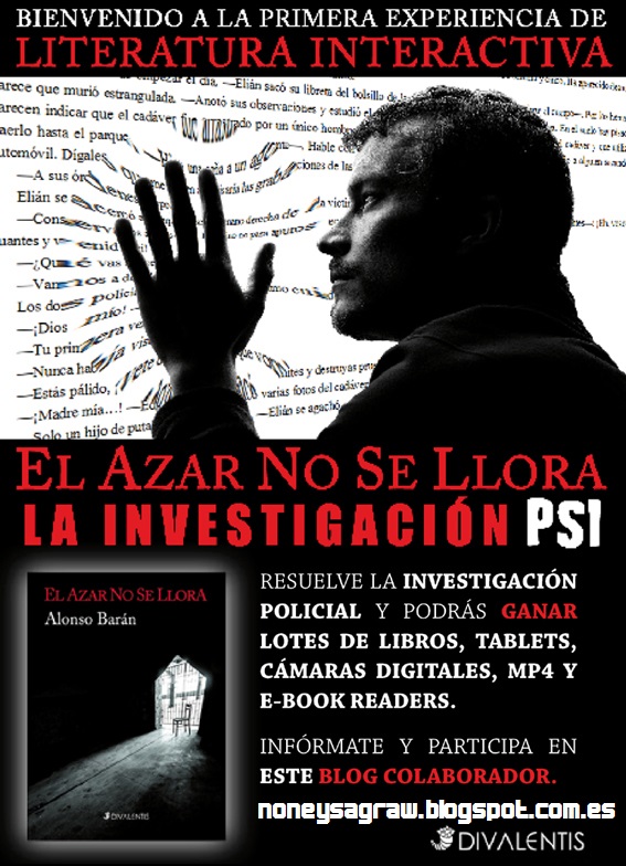 Como parte del universo literario creado por Alonso Barán en su thriller psicológico EL AZAR NO SE LLORA y en su afán por ofrecer nuevas posibilidades a los amantes de la literatura, la editorial Divalentis y Alonso Barán os presentan la primera experiencia de Literatura Interactiva: EL AZAR NO SE LLORA - LA INVESTIGACIÓN PSI.Desde el 2 de noviembre de 2015 hasta el 4 de enero de 2016, LA INVESTIGACIÓN PSI es una innovadora forma de vivir la literatura, gracias a la cual podrás ser partícipe de ella, metiéndote en la piel de Elián Ventura, el inspector de policía protagonista de EL AZAR NO SE LLORA, y siguiendo una investigación policial en la que recorrerás virtualmente la ciudad de Nueva York en busca de pistas. Además podrás enviar a la editorial la respuesta que consideres correcta a los acertijos que se te planteen y entrar en el sorteo semanal de regalos.