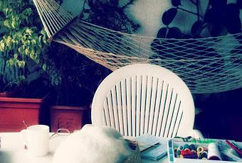 Aquí en este pequeño rincón de la casa y acompañada por uno de mis gatos, me refugio entrada la tarde, aprovechando la luz natural para crochetear un montón de cosas pendientes de entrega y con la manguera debajo- no la veís pero está- para refrescarme de cuando en cuando