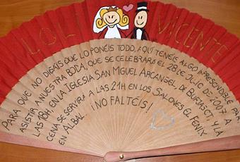 Solo tendrás que escribir un texto divertido con los datos de vuestra boda en un abanico, podréis encontrarlos muy baratos en las tiendas multiprecios.