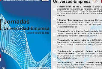 El próximo 28 de febrero, la Escuela de Ingeniería Minera e Industrial de Almadén (EIMIA), de la Universidad de Castilla La Mancha (UCLM), organizará la II Jornada sobre las relaciones Universidad-Empresa con la intención de abrir la participación a las empresas, tanto de Castilla La Mancha, como de las comunidades limítrofes, que tengan interés en conocer las actividades de investigación aplicada y la transferencia de conocimiento que se desarrollan en la Universidad, al tiempo que constituir un foro de debate muy necesario en la coyuntura económica actual.