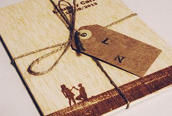 Por fin os puedo enseñar las invitaciones que hemos hecho para unos novios muy especiales, Laura y Carlos. Querían algo rústico y original, y por aquel entonces yo estaba probando a transferir fotos a madera y les propuse ese soporte. Se entusiasmaron porque querían utilizar las fotos de preboda que les había hecho, pero en qué momento se me ocurrió, pues la Semana Santa la pasamos haciendo pruebas y más pruebas, pegándonos con las tablillas de contrachapado, quizá demasiado porosas o qué sé yo, pero nada dispuestas a colaborar.