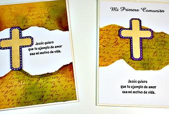 Para hacer estas tarjetas utilicé cartulinas, tintas y sellos. El sello es de la marca Uchi's design y es el kit "Comuniones". Lo mejor es que está en español y tiene unas frases preciosas, yo lo compré en Mi Tienda de Arte y me costó 15,95€