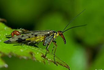 Normalmente cuando pensamos en animales con este tipo de atributos superdesarrollados y a veces grotescos, nos vienen a la cabeza aves como el pavo real o mamíferos como los ciervos, pero quizás el grupo de animales que presenta una mayor variedad de adornos, colores y estructuras relacionadas con el cortejo y la selección sexual, sean los insectos. Entre ellos hay escarabajos con impresionantes cornamentas, mariposas multicolores, insectos que desprenden luces químicas, o moscas metalizadas. Uno de los insectos que han sido más estudiados como ejemplo de selección sexual han sido las Moscas escorpión, que curiosamente ni son moscas ni son escorpiones, y son totalmente inofensivas. Estos insectos pertenecen al orden de los Mecópteros y entre sus características anatómicas destaca su mandíbula transformada en un largo pico y la presencia de un apéndice abdominal acabado en una pinza, presente sólo en los machos y que recuerda al aguijón de un escorpión. Ese apéndice tiene la función de sujetar a la hembra durante la cópula. Pero el macho de mosca escorpión no tiene el éxito garantizado sólo por tener un aspecto imponente y llamativo, si quiere triunfar y conseguir a una hembra deberá antes invitarla a comer, sino no hay nada que hacer, y más vale que la comida sea de su agrado, porque sino lo rechazará sin contemplaciones.