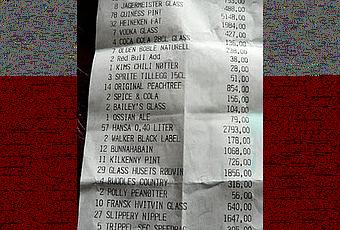 Esto es lo que les paso supuestamente a IRON MAIDEN durante su estancia en la ciudad de Bergen (Noruega) el 10.08.2010. Si miras la factura hay algunas "observaciones":78 Guiness Pints27 Slippery Nipples ( chupitos)13 Jack Daniels...pocos me parece a mi!... más el resto.y la hora 17.42... ¿del día siguiente quizás?