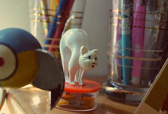 Lo ideal es que una mesa escritorio este libre de telares, limpia y vacía, pero yo no sigo esa norma, como paso tanto tiempo en ella, me gusta ver cosas distintas, a veces graciosas, otras mas austeras, otras mas friki, sobre todo, si estoy viendo alguna serie adictiva, eso hace que pueda haber algún guiño en mi mesa escritorio. No sé si os habéis fijado en la cajita vintage de años 50-60 la del gatito blanco, es super divertida, solo deciros que la cabecita del gato es oscilante!!