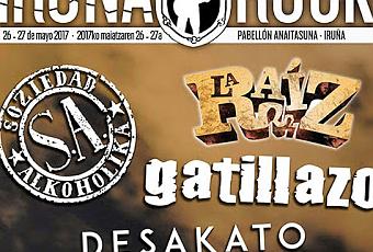 Soziedad Alkoholika, Gatillazo, Desakato y La Raíz son los cuatro primeros grupos para el cartel del nuevo festival Iruña Rock, a celebrar los días 26 y 27 de mayo de 2017 en el Pabellón Anaitasuna de Pamplona. Las entradas se pondrán pronto a la venta.
