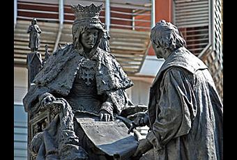 - La ilustración es un detalle del monumento en Granada: La reina apoyó con entusiasmo los planes de Cristóbal Colónpara llegar a las Indias por una nueva ruta oceánica. Tuvieron gran influencia los hombres de las Iglesia, Fray Juan Pérez, monje del monasterio de La Rábida animó a Colón a entrevistarse con ella, de la que había sido su confesor. En Granada, fue la primera en aceptar las exigencias de Colón, en las Capitulaciones de Santa Fe.