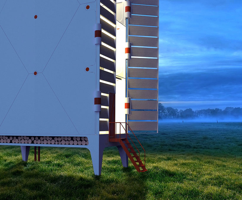 están fijados al cuerpo principal de la estructura a través de bisagras equipadas con motores eléctricos. la energía solar generada a partir de la cabina se utiliza para operar esta red controlado por ordenador, inclinando los paneles de lamas para lograr el agrado de los habitantes, cerrandose automáticamente cuando se acerca una tormenta.