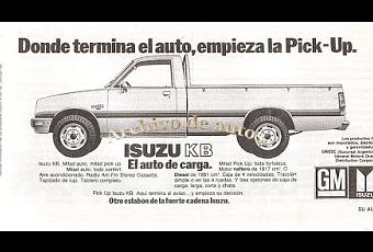 La publicidad, un pie de página, publicado en la página 11 de la revista Su Auto, número 18 de abril de 1981, es decir hace 39 años, nos daba cuenta de las camionetas japonesas de la marca Isuzu para su modelo KB. Esta empresa del Lejano Oriente era parte de General Motors Corporation.